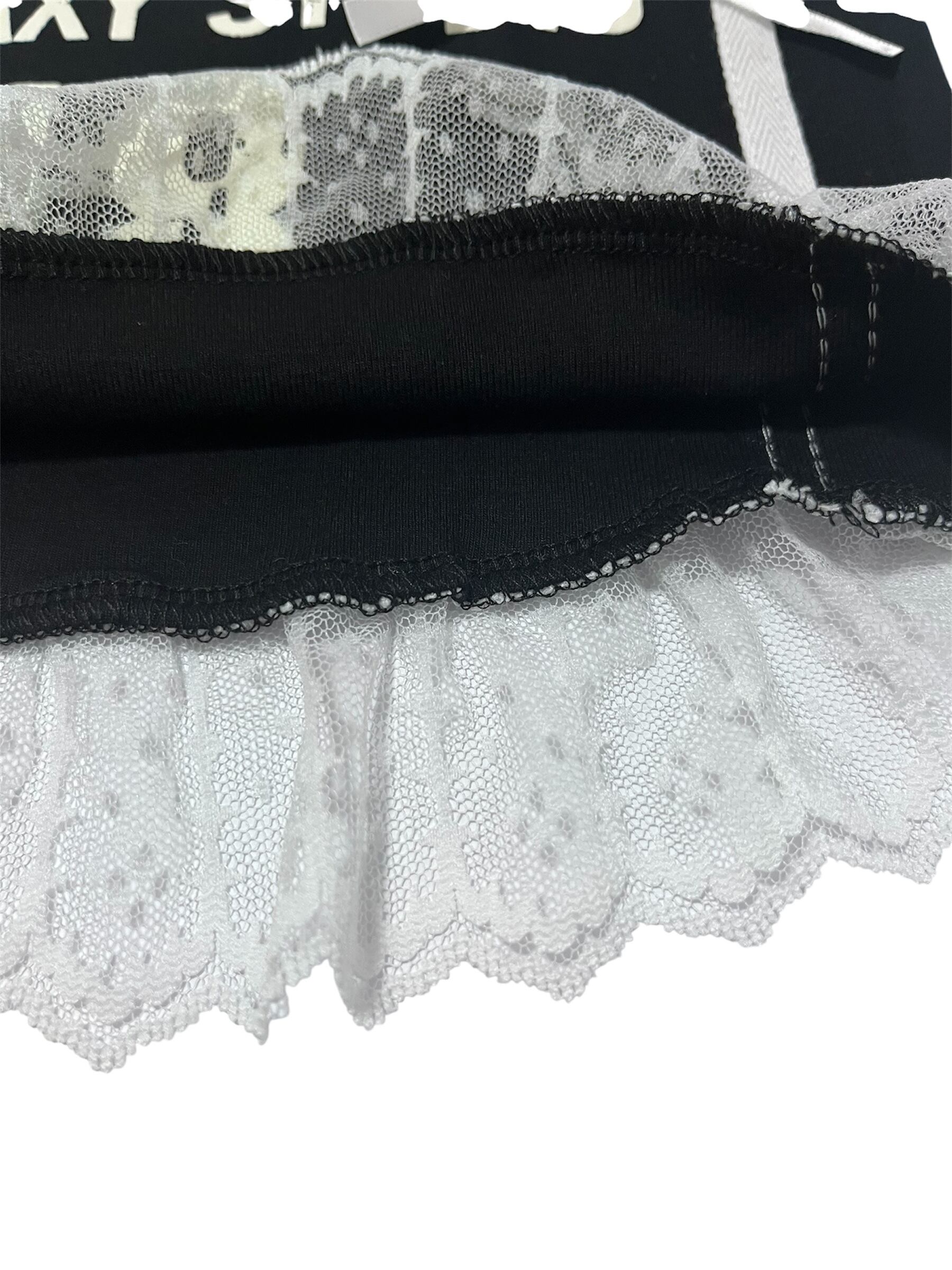 胸元にはプリントが施され、スポーティーな印象に。さらに、裾には可愛らしいレースがあしらわれ、カジュアルながらもエレガントな雰囲気を演出します。