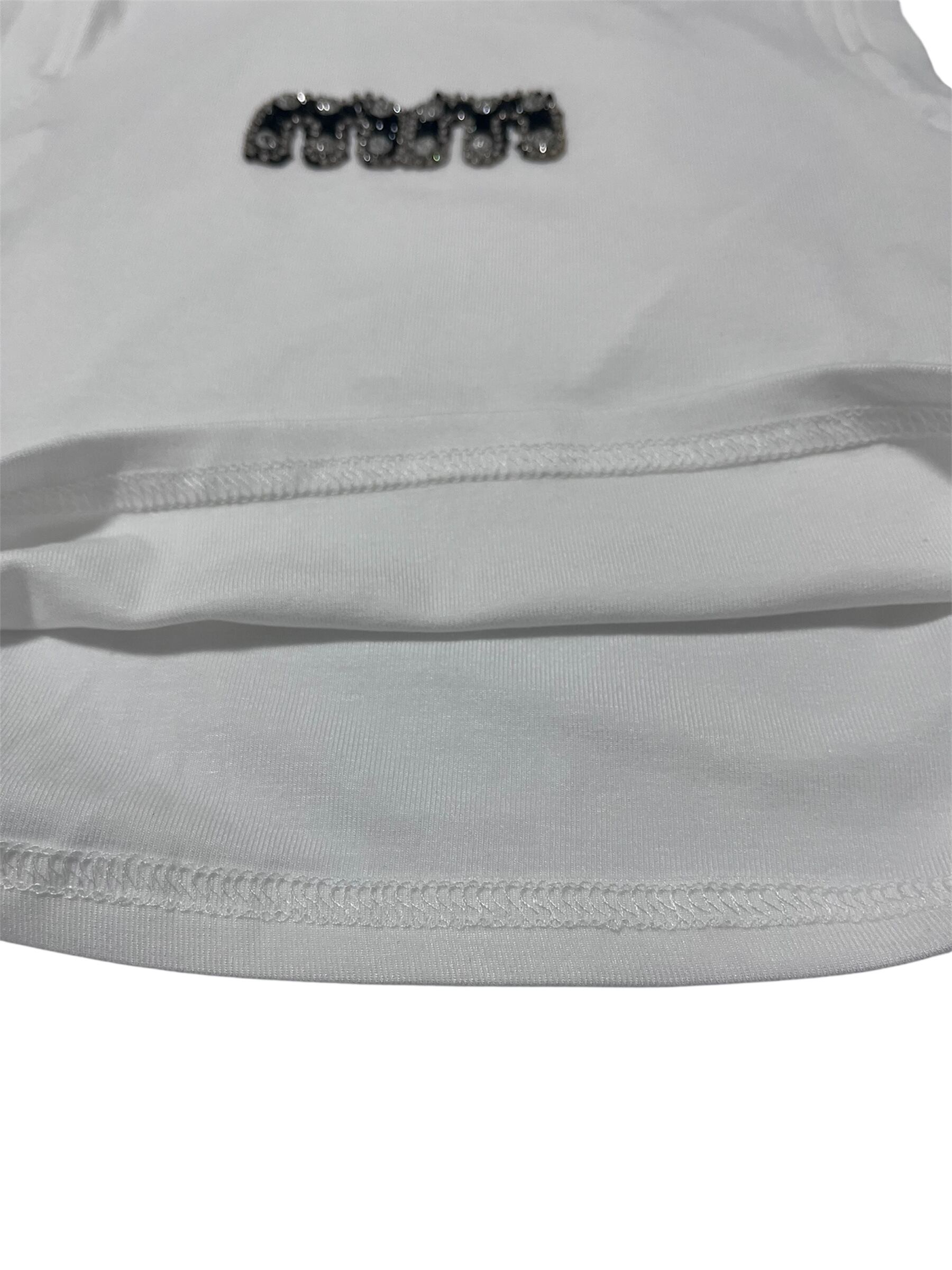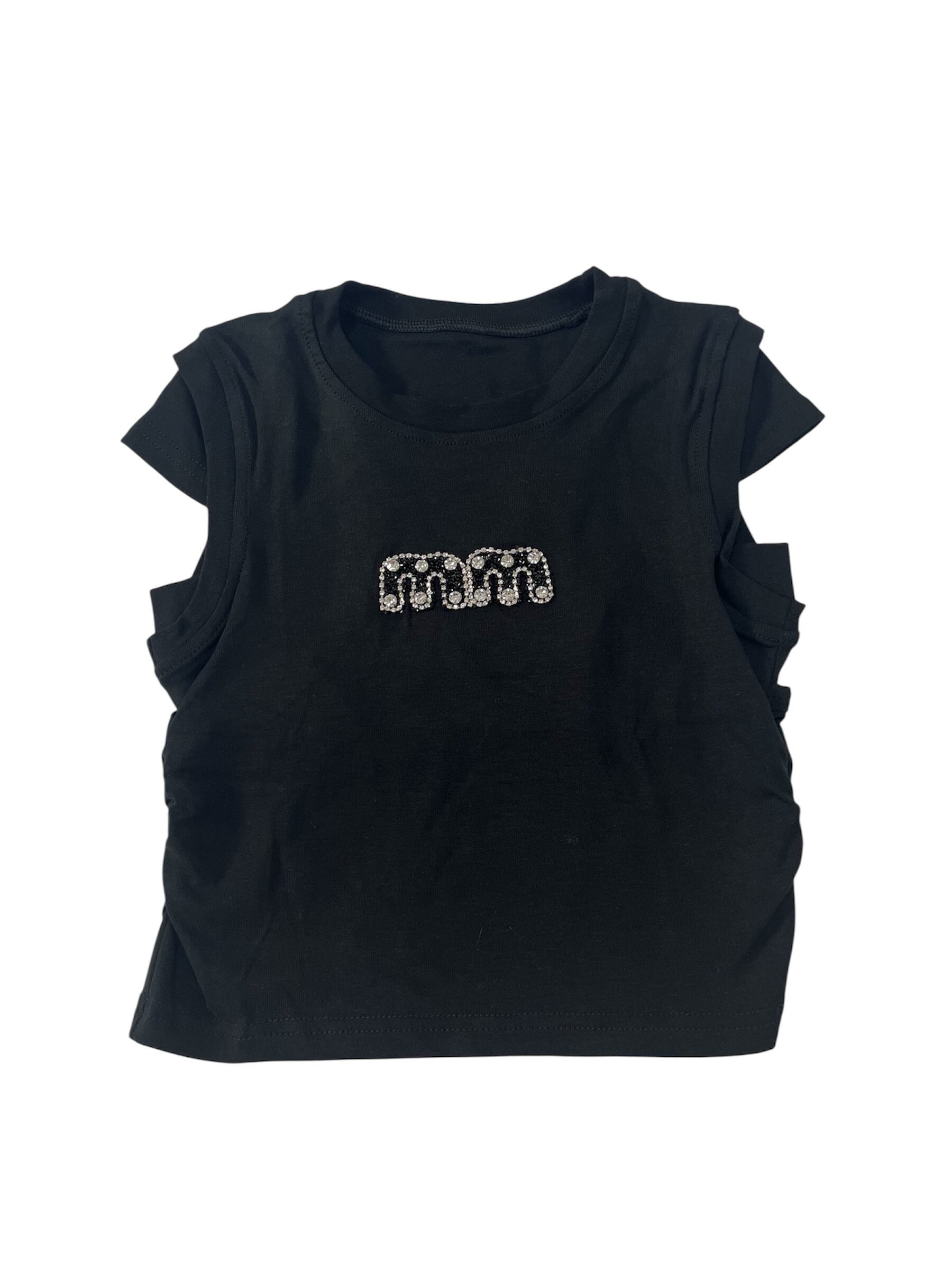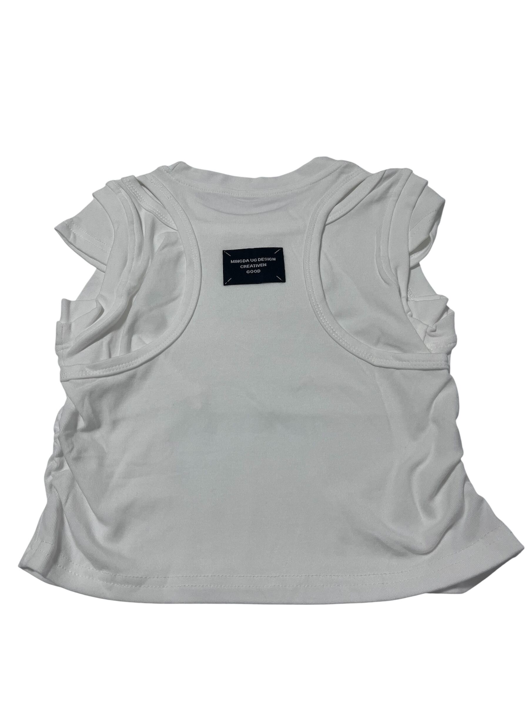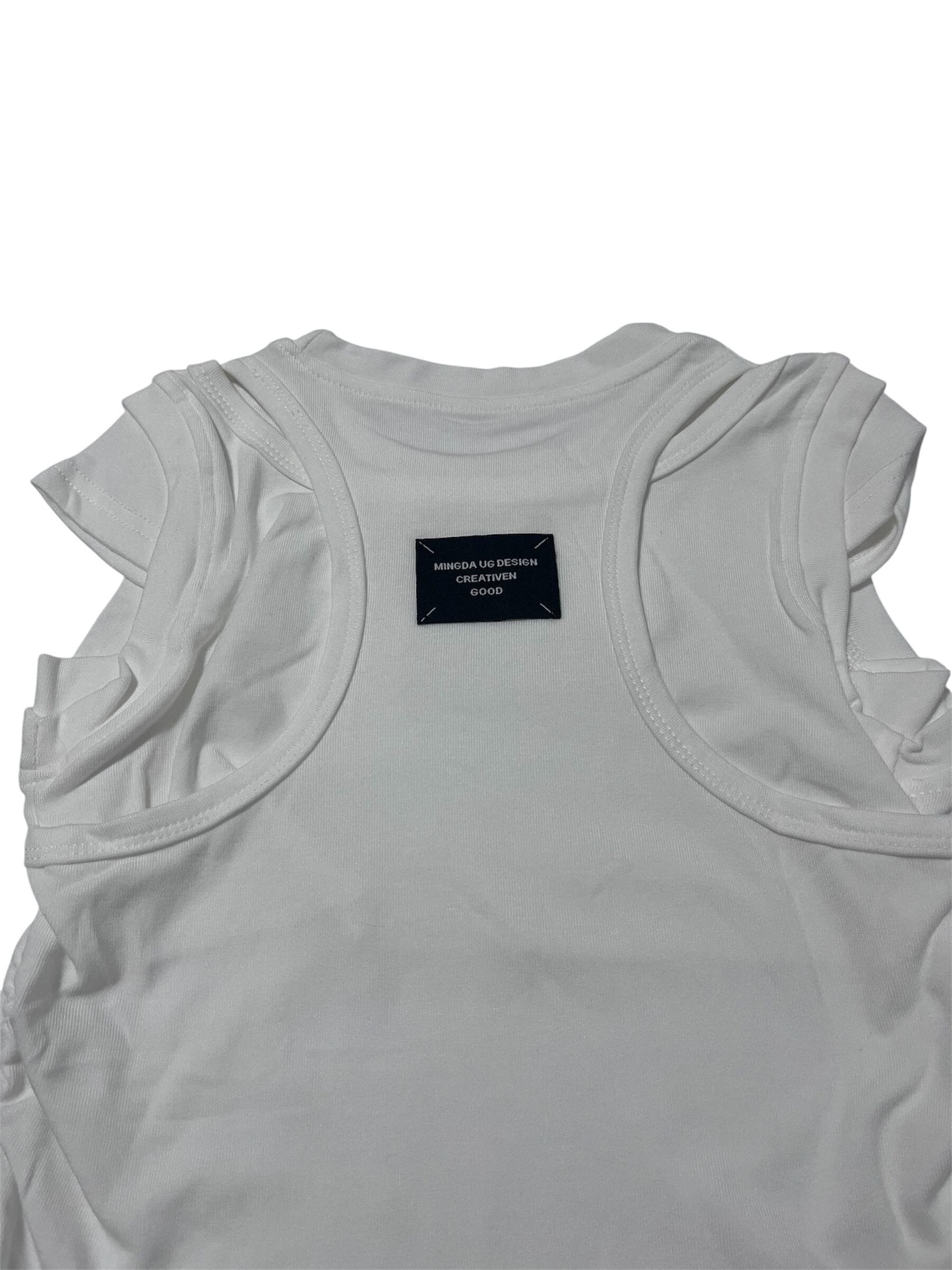 フロントにはシンプルなロゴ刺繍、背中には大胆なスリット風カットとタグデザインがアクセントに。