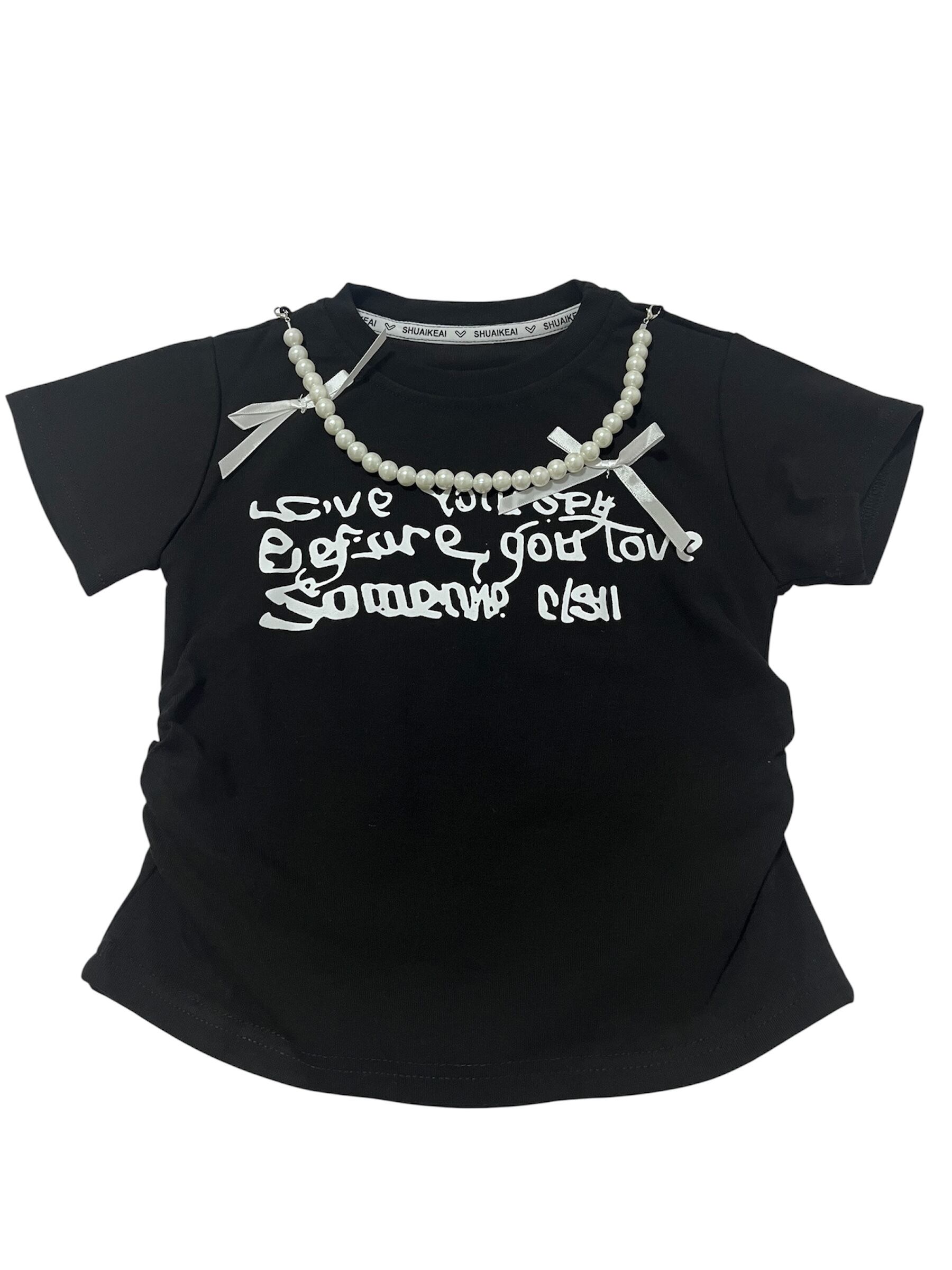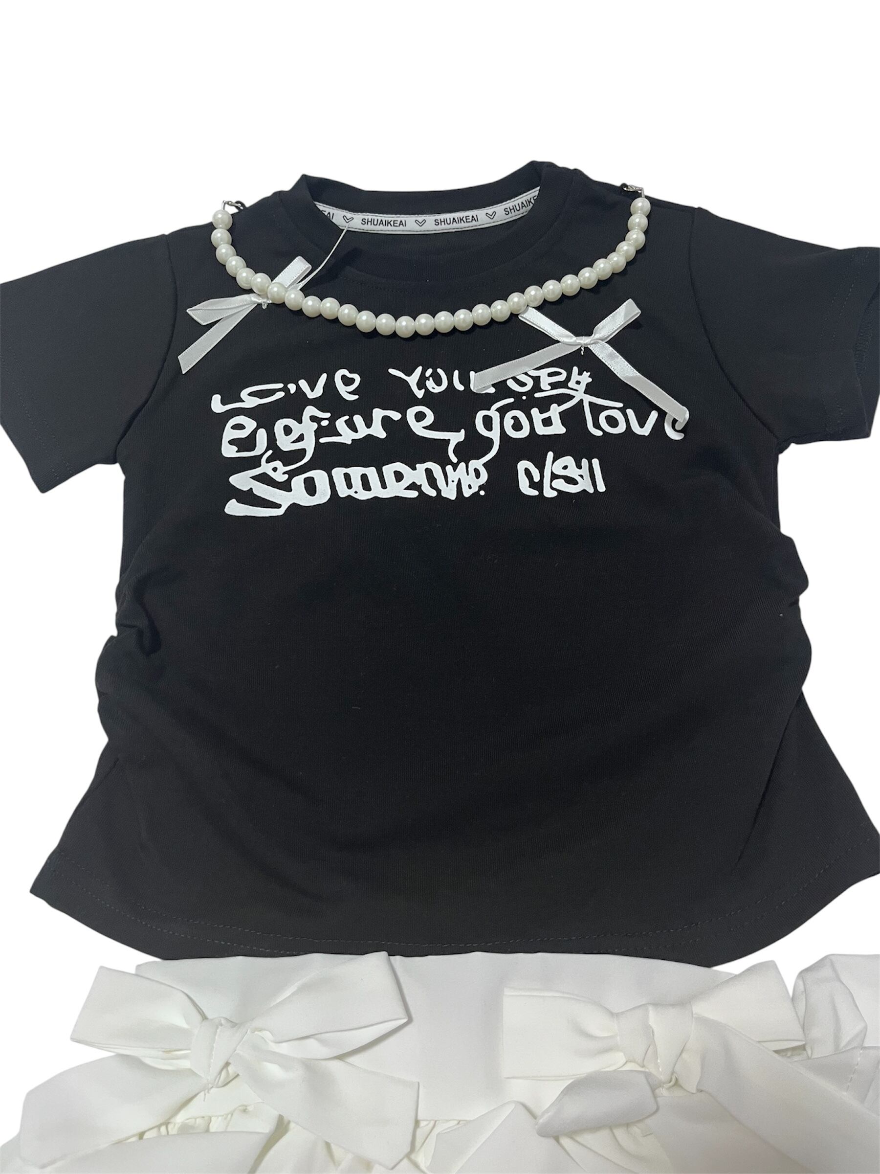 パール風ネックレス&リボンがアクセントのTシャツと、3段ティアードに大きなリボン付きスカートがセットになった、ガーリー全開のキッズセットアップ♡