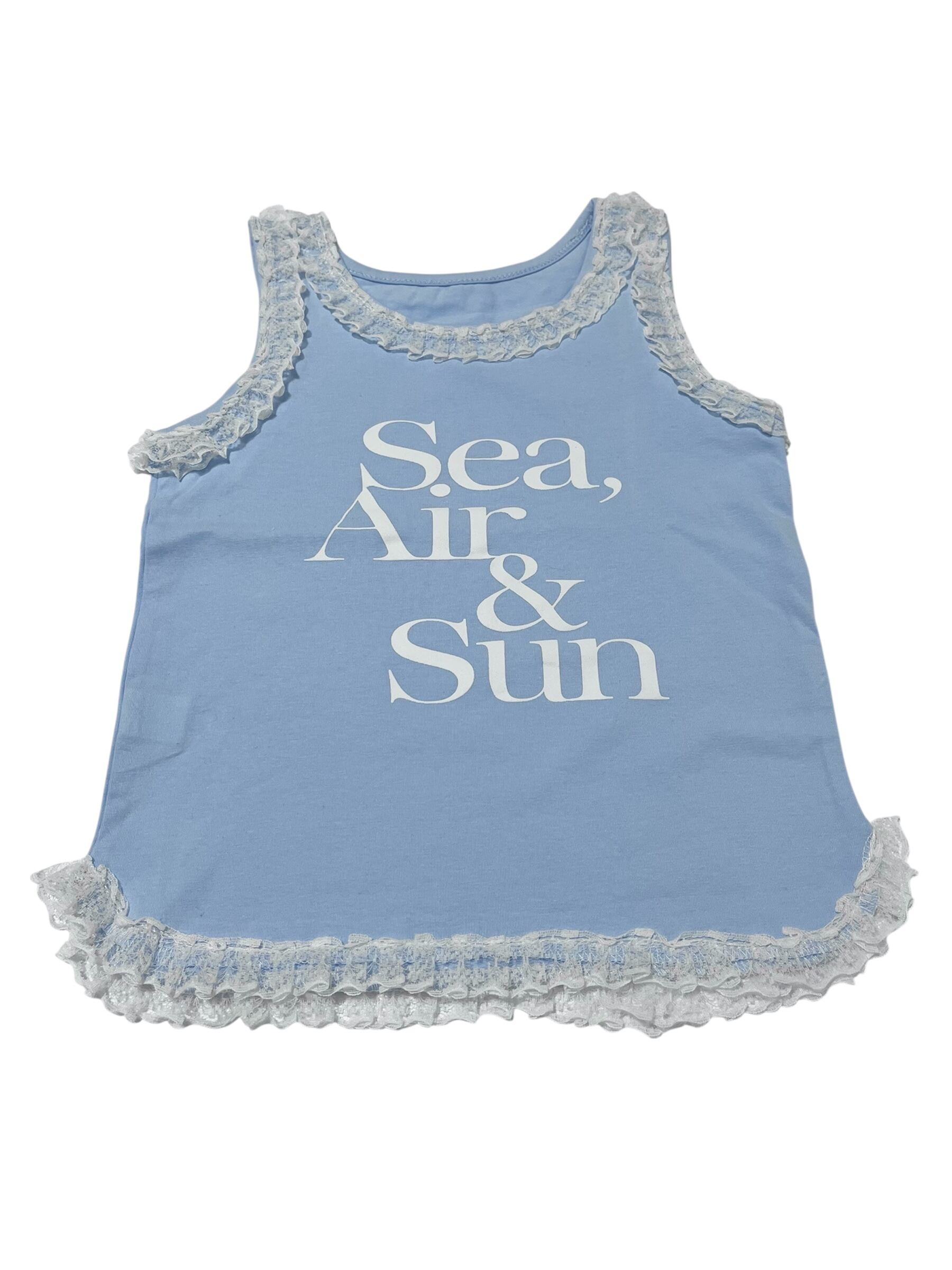 胸元には「Sea, Air & Sun」のおしゃれなロゴがプリントされ、夏の気分をぐっと盛り上げます。ネックラインと裾には繊細なレースフリルをあしらい、涼しげでガーリーな印象に。